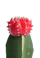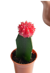 The Red Moon Cactus is a striking grafted cactus featuring a vibrant red top (gymnocalycium) perched on a green cactus base (hylocereus). The red top, which lacks chlorophyll, relies on the green base for nutrients, making it a unique and eye-catching plant. Compact and colorful, it is perfect for tabletops, desks, or small plant collections, adding a pop of brightness to any space.